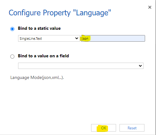 9. The Configure Property window is open, select Bind to a static value option and type the language mode and click on OK button.
