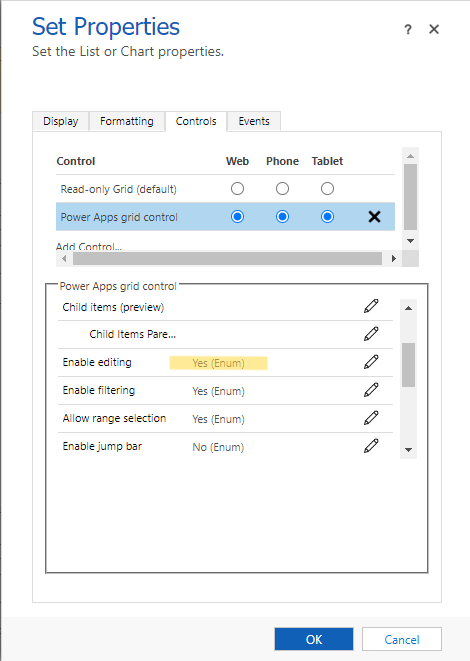 2. Set the Power Apps grid control editable on subgrid Controls tab