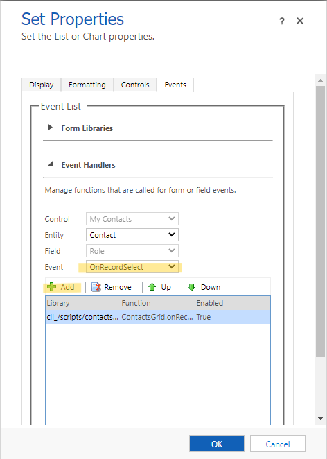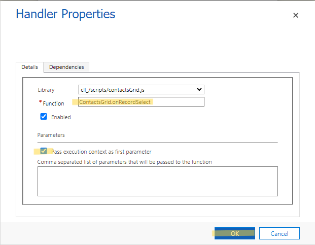 4. Set the name of the functon(ContactsGrid.onRecordSelect), mark the checkbox "Pass execution context as first parameter"