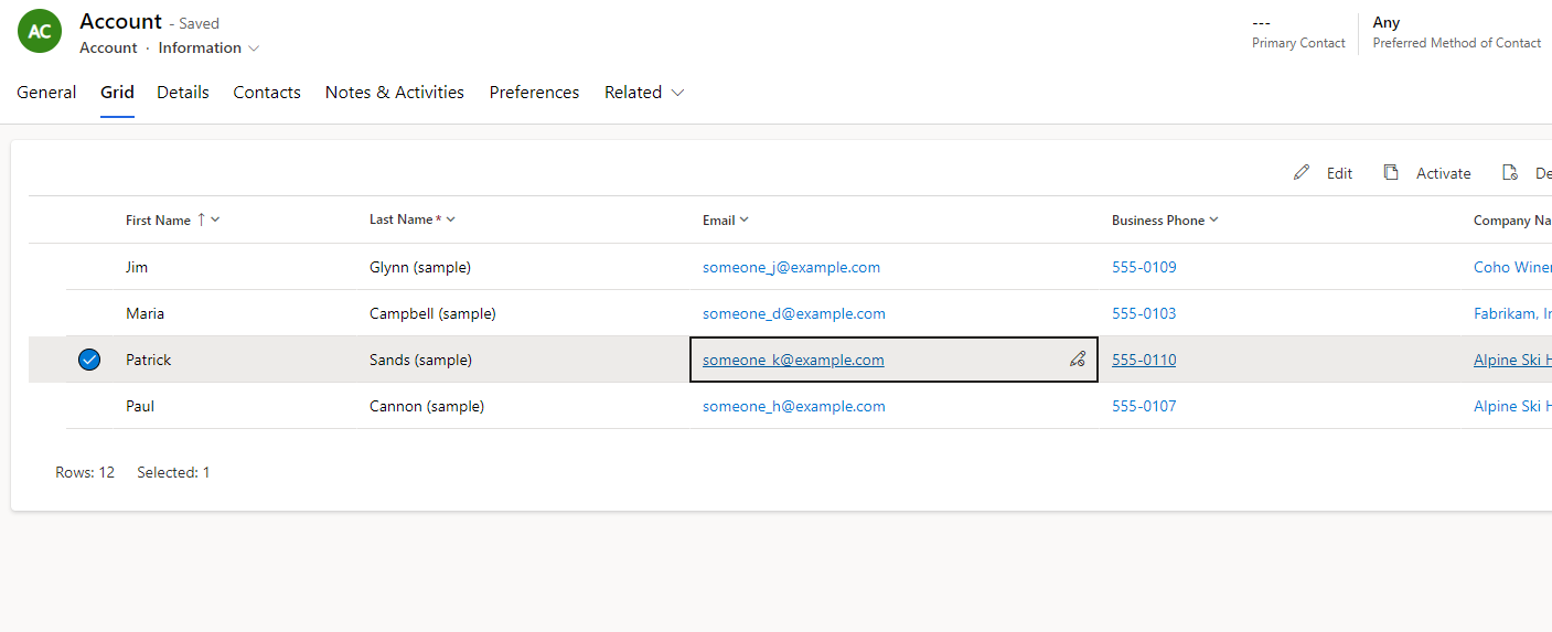 5. Below is the code inside the library "cll_/scripts/contactsGrid.js" , the code disable a cell if the name of the attribute is "emailaddress1".